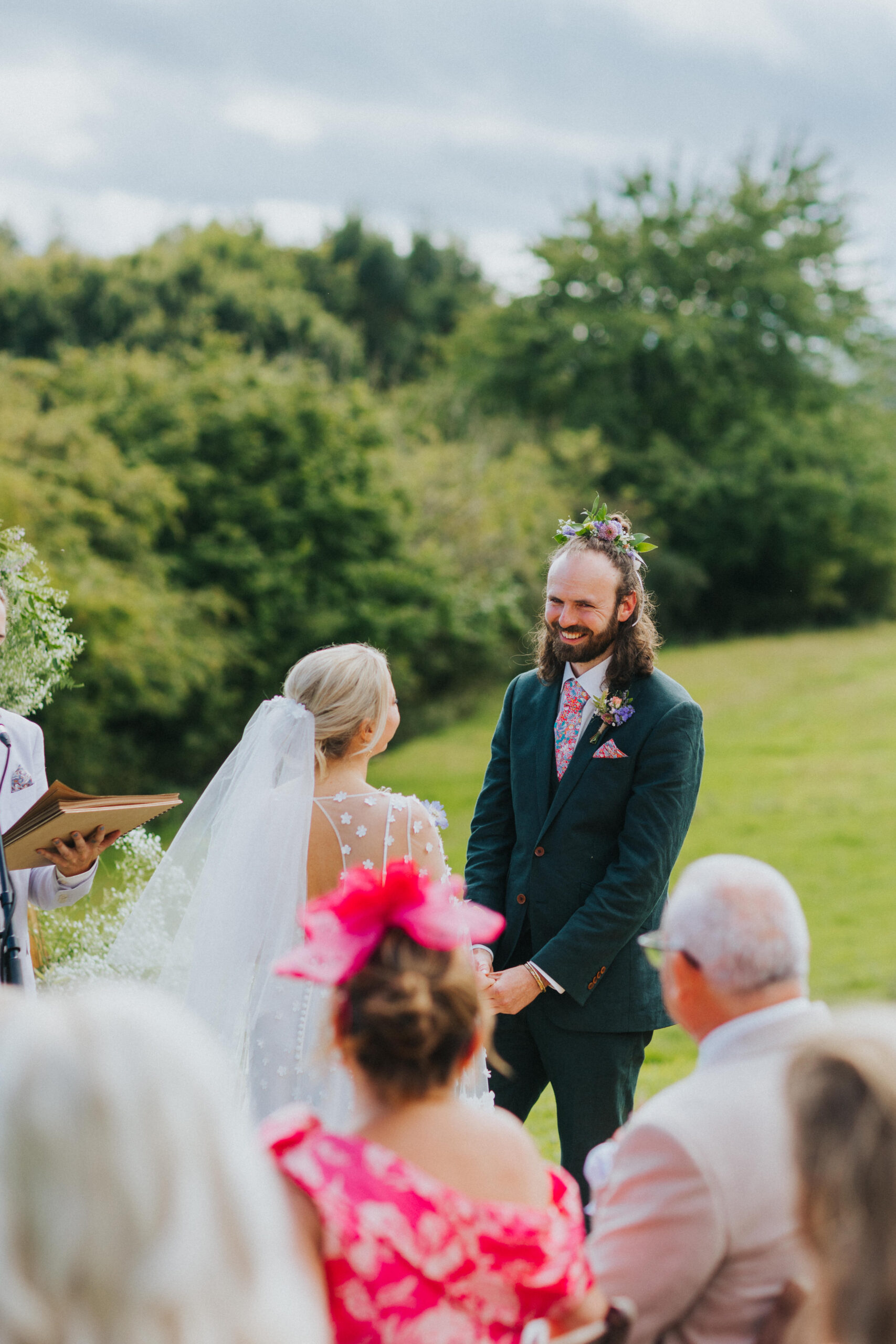 The ceremony took place outside, under a handmade wooden arbour, lovingly built by their friends just the day before. Overlooking the soft, hazy beauty of the hills, Sam & Joe stood hand in hand as one of their friends “fake-married” them in a personal, laughter-filled ceremony (they’d already done the legal bit in private). It was honest, funny, and full of heart — just like them.