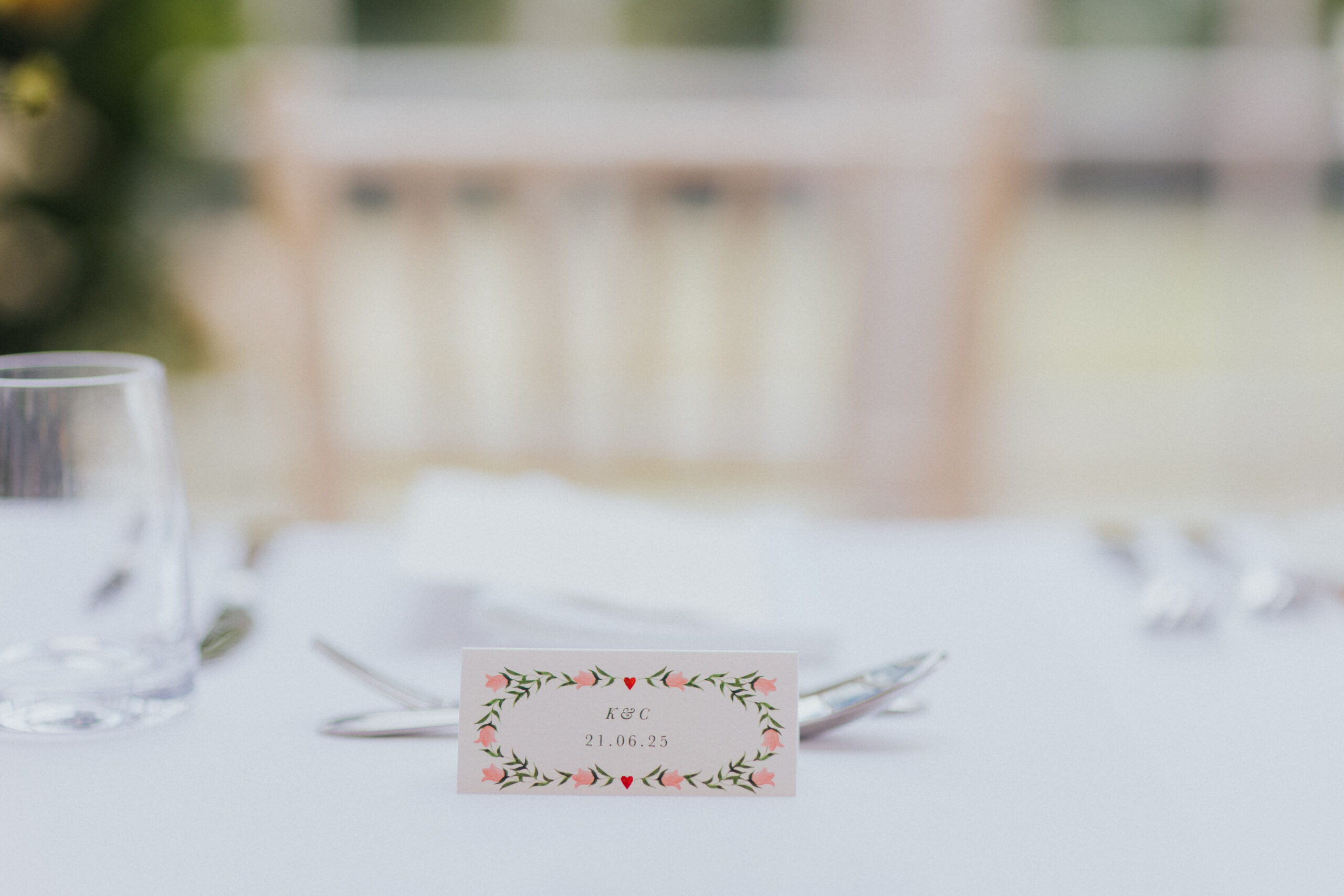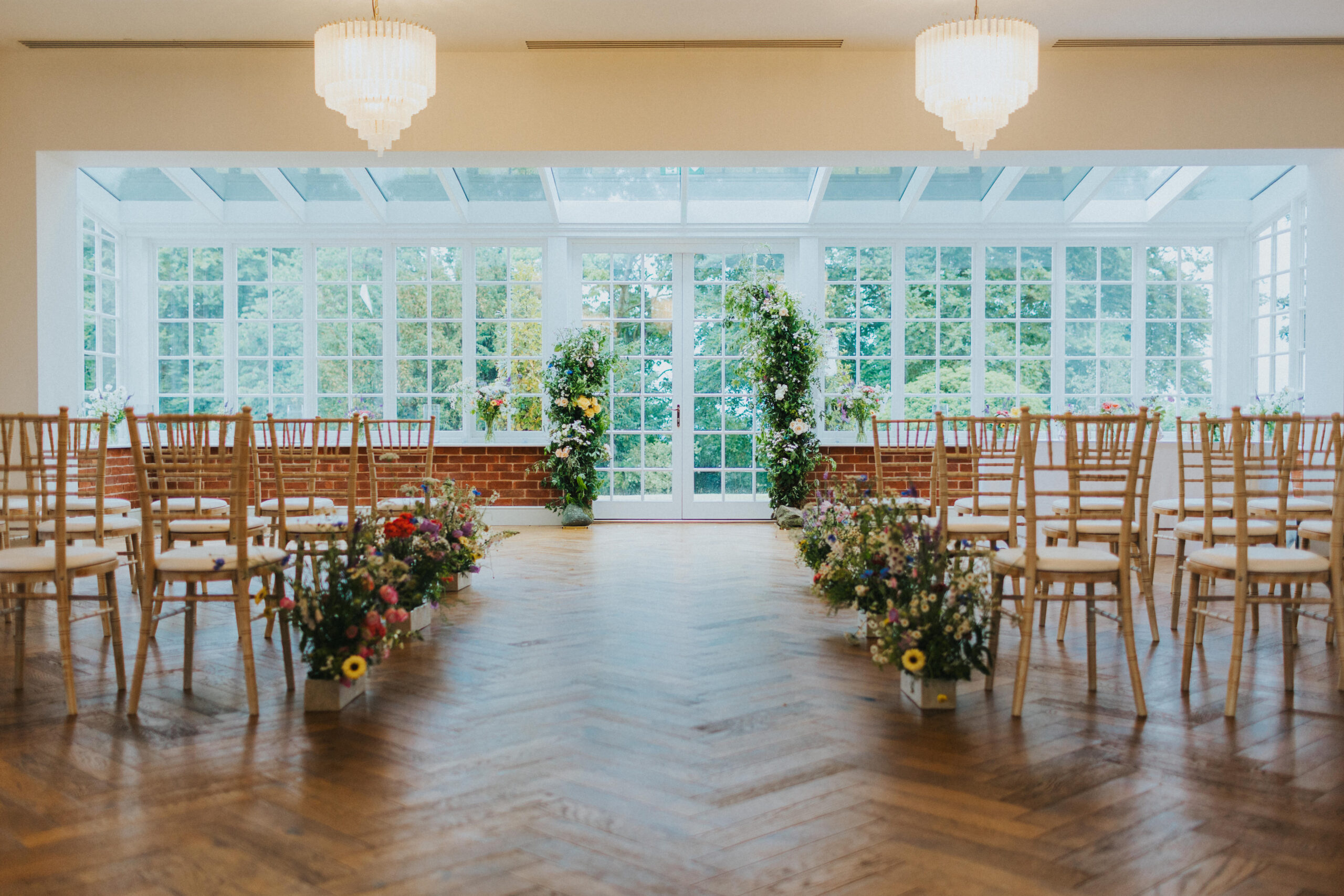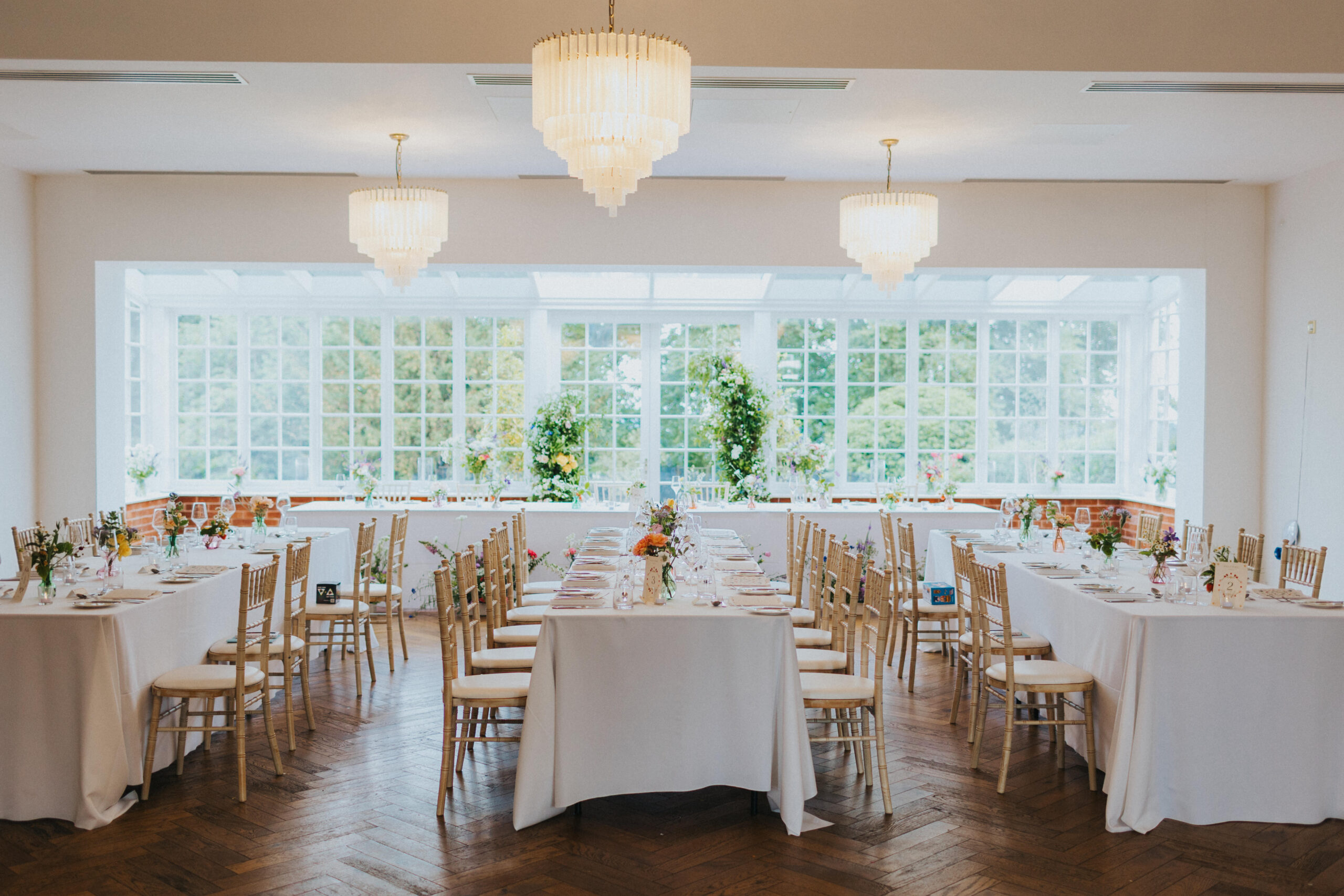 Chris and Kate had originally planned to say their vows outside in Stockton House’s gardens. June weather, however, had other ideas. Instead, their ceremony moved indoors, and it was just as special. The ceremony room, filled with natural light from Stockton House’s beautiful large windows, created a soft, romantic atmosphere that worked perfectly with their floral styling.